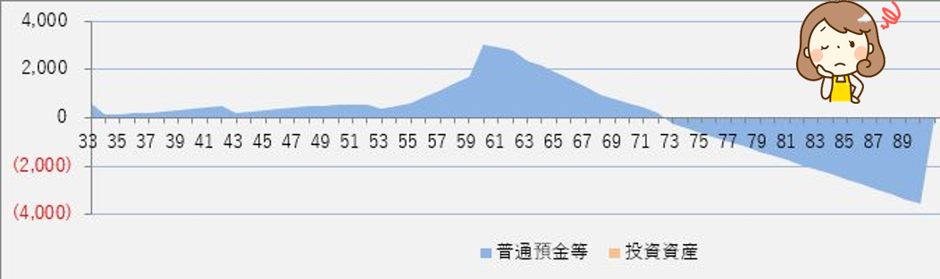 この場合、住宅購入後、収支は非常に厳しく、普通預金はなかなか増えていきません。夫が定年退職金をもらうときには金融資産がいったん3000万円ほどになりますが、その後、どんどん資産が減っていき、”70代で枯渇”してしまうおそれがあります。