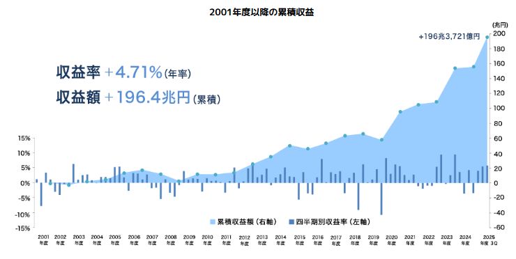 GPIFの運用成績は2001~2025年度代四半期までのの年率平均で4.71%、約24年の運用の効果によって196兆円も増やしているよう。