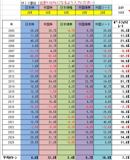 この5つの資産に均等に分散投資した場合の結果を見てみましょう。